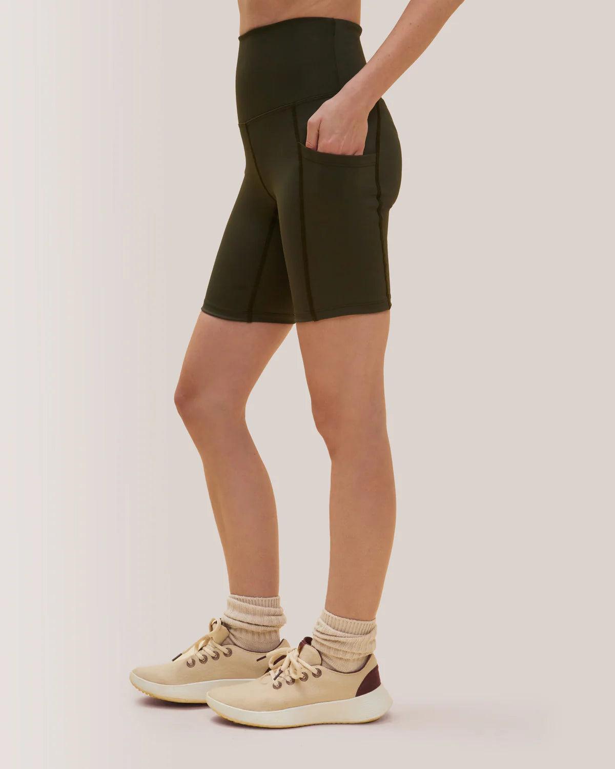 Our Divine Shorts with Pockets are your go-to for nature hikes and a busy lifestyle. Made from our eco-friendly EcoFit fabric, these shorts feature an inseam that falls above the knee and are slightly shorter than our New Moon Bike Shorts. These shorts offer style and functionality with a classic cut and an ultra-high waist. The two side pockets provide convenient storage for your essentials, allowing you to keep your hands free to focus on the trail ahead.