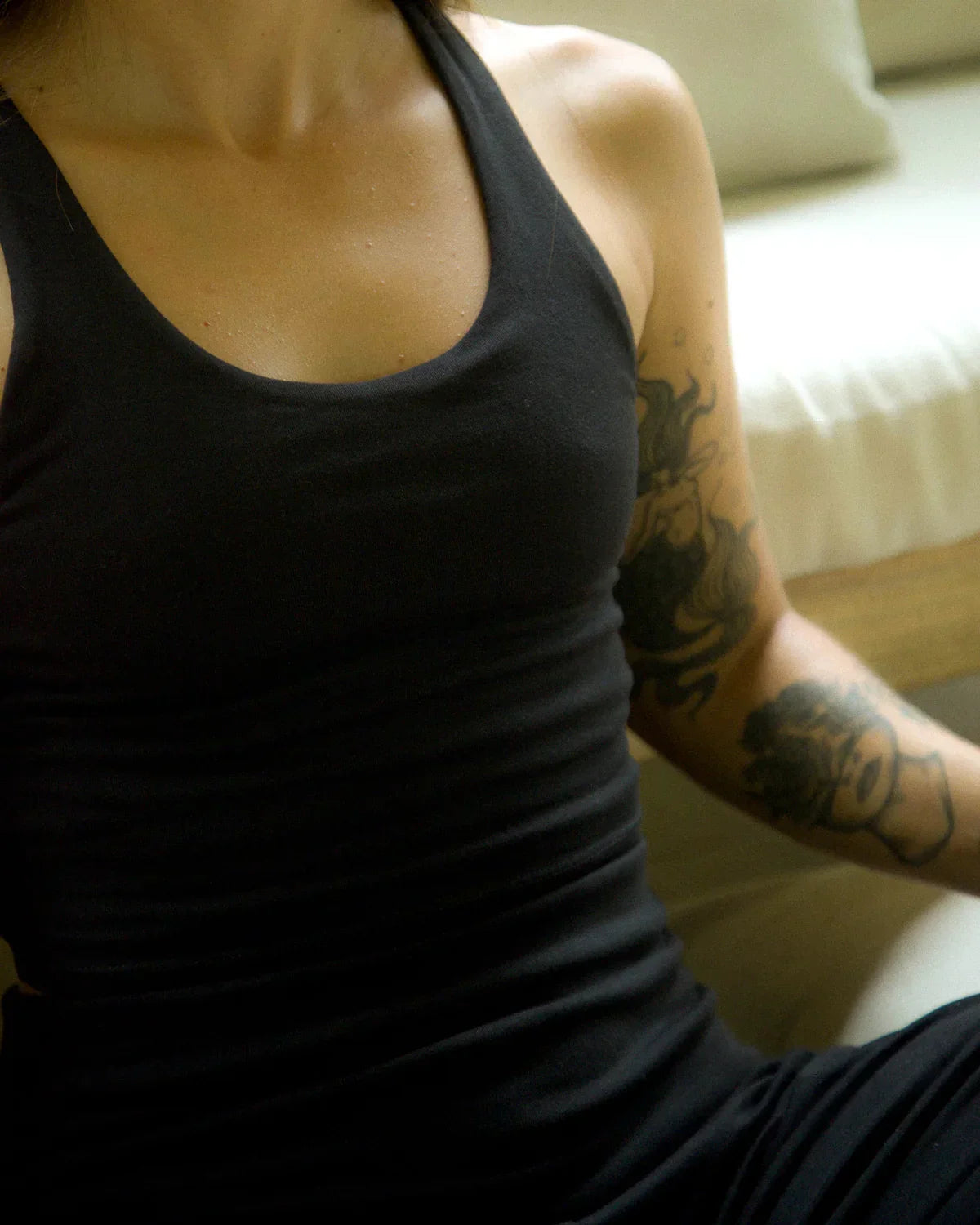 Me Time Detox Tank. Designed for mindful layering and seamless support. With its longline cut and integrated self-bra, this ultra-soft cami hugs your silhouette while letting your skin breathe. Made from 94 % cotton and 6 % elastane, it’s gentle on you and the planet. Free from microplastics or synthetic recycled fibers and certified Oeko-Tex for complete peace of mind.