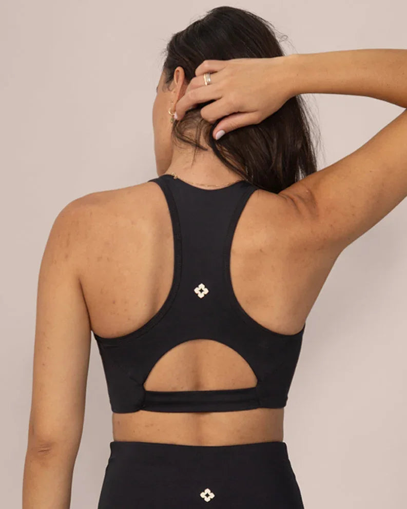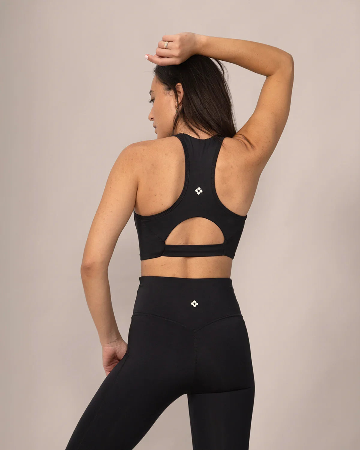 The Serena Bra supports, secures, and moves with you — an eco-conscious essential designed for flow, from studio to street. The Total Eclipse (black) shade is your new go-to essential.