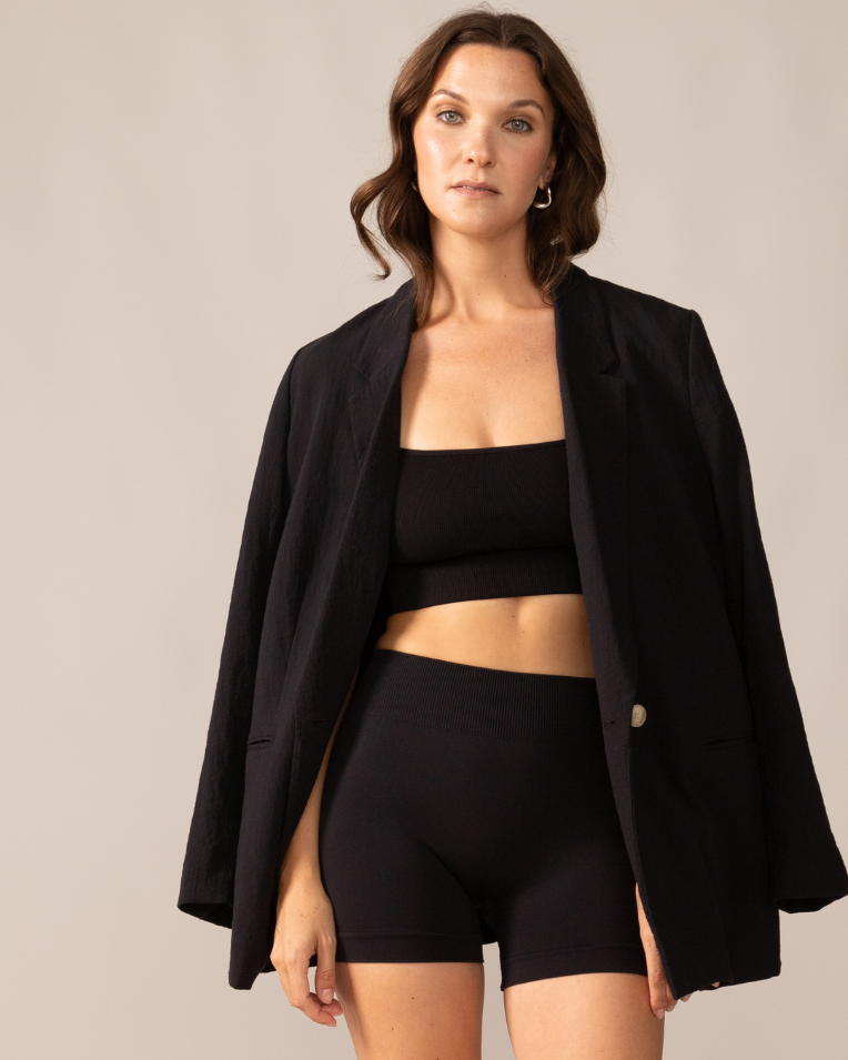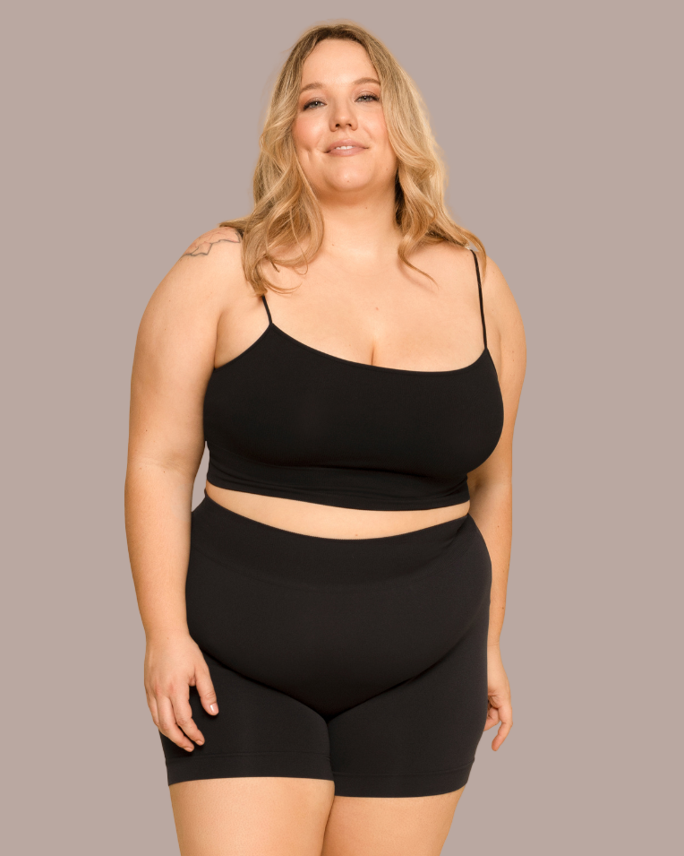 A person wearing black seamless undershorts. Megan is 5'8" and wears a size M.