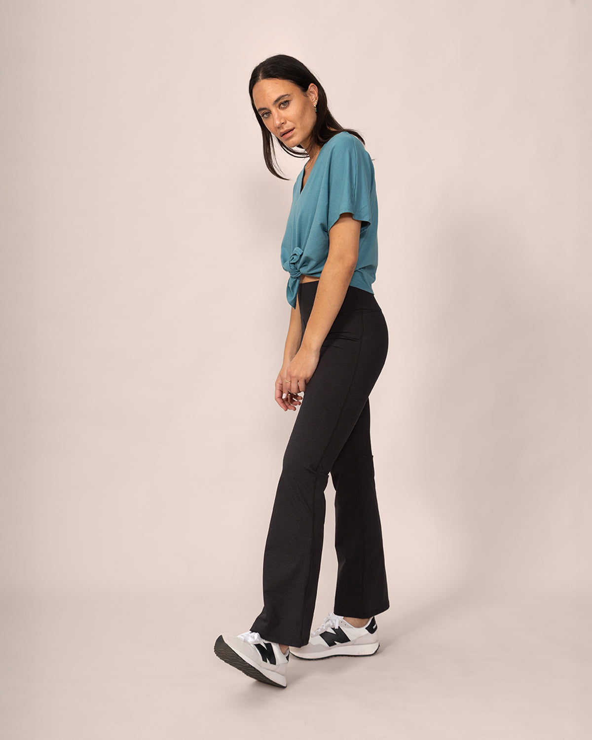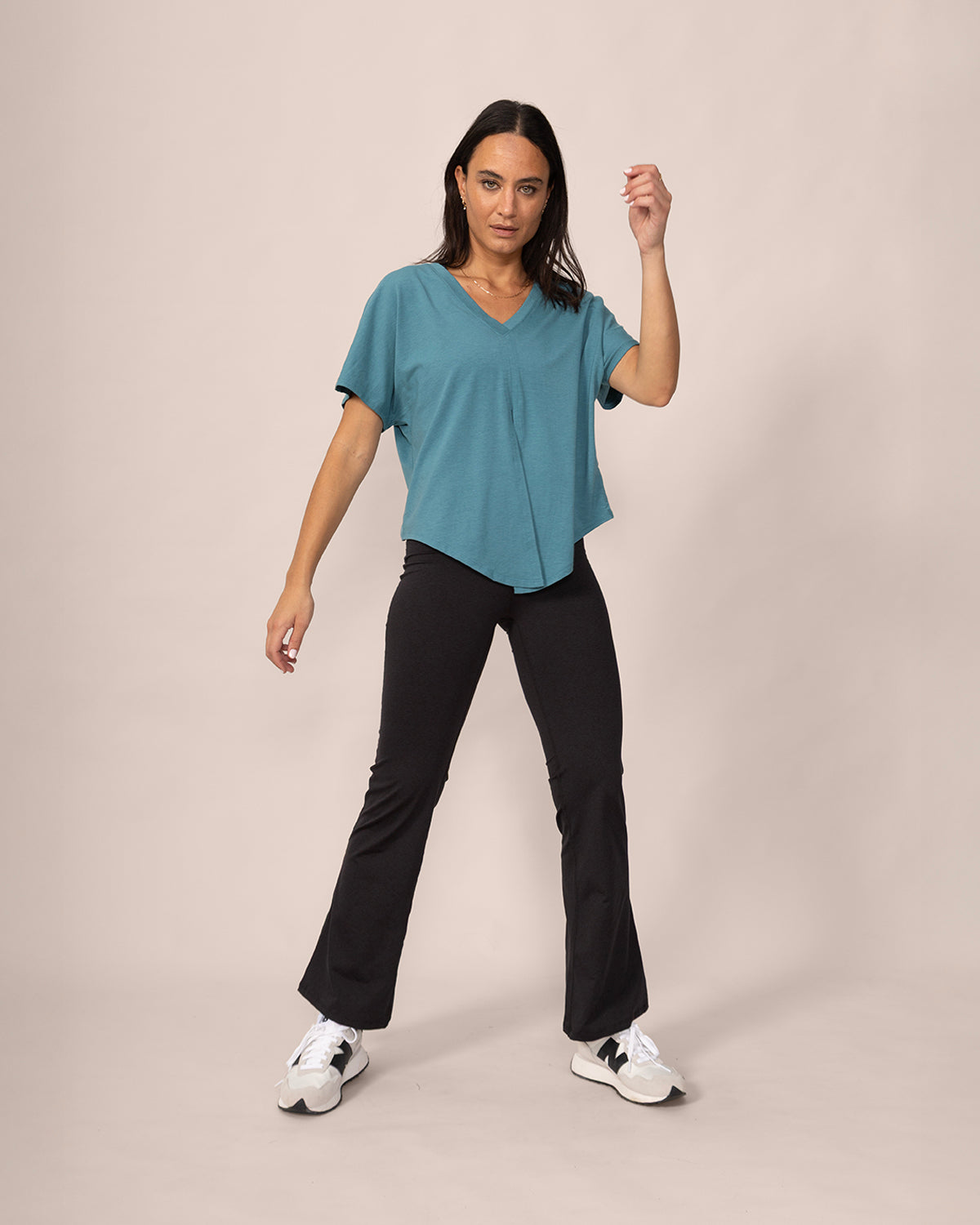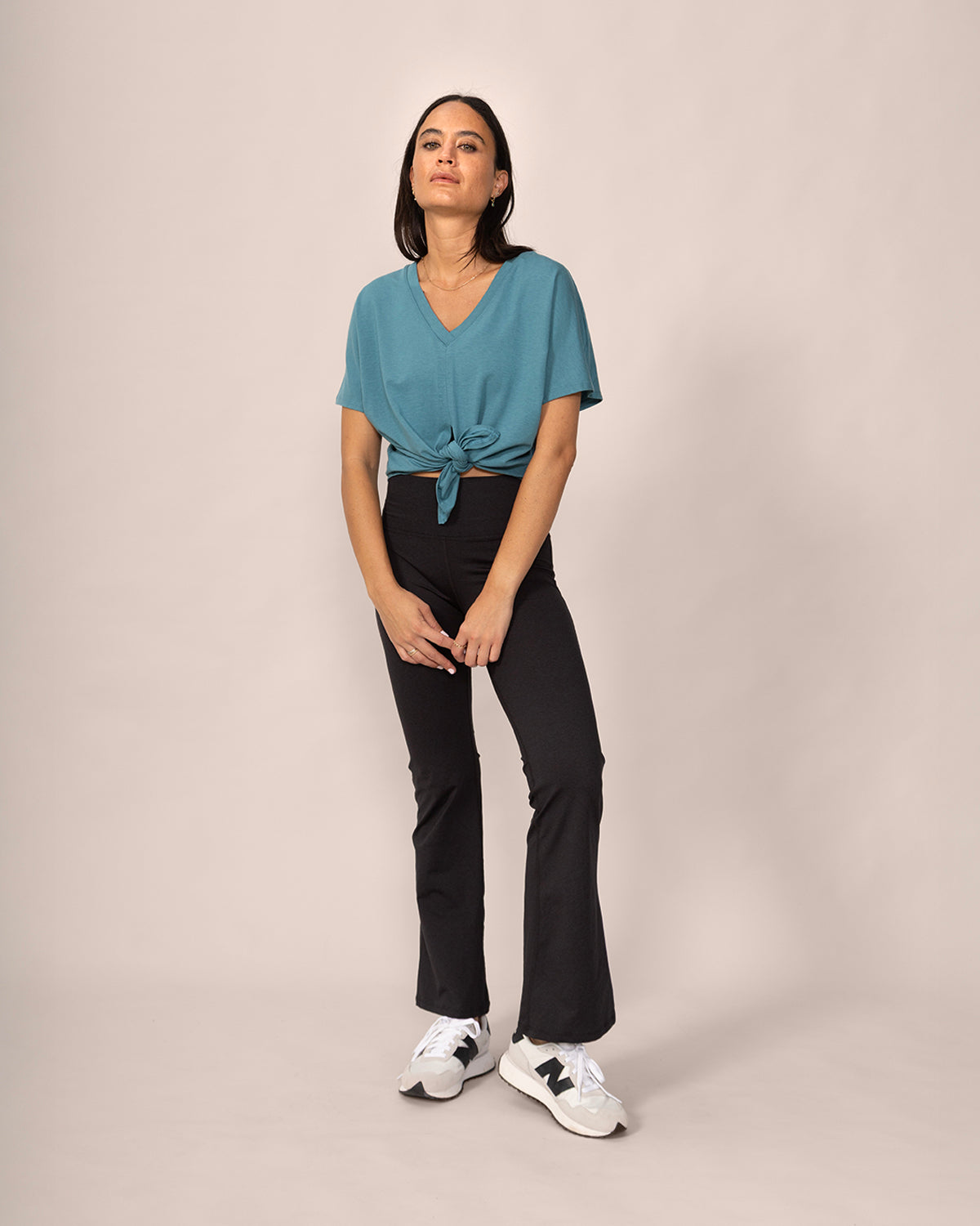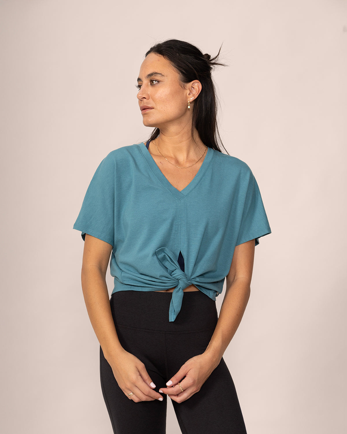 Your classic tee, reinvented. Cute and hip, our Jasper T-Shirt features a relaxed fit with a V-neck that you can wear in the front or back. Made from our soothing BioSoft fabric, its gentle TENCEL™ blend has breathable, thermoregulating properties for changing temps. Tie it up for a more fitted and playful look, and get yourself on to the studio ASAP!