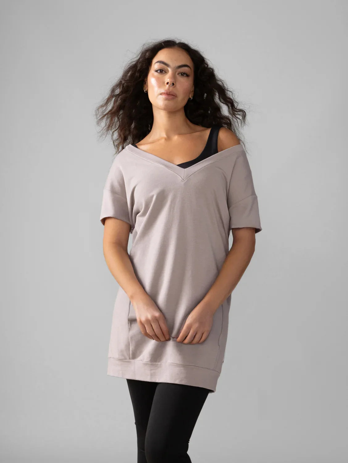 The go-to long sweater dress you’ll want to wear every day! Made from lightweight, super-soft French terry Tencel and cotton for a lived-in feel. Featuring a classic V-neckline, raw edge sleeves for a stylish touch, and a relaxed fit throughout, it’s an easy pick for warm-weather days.