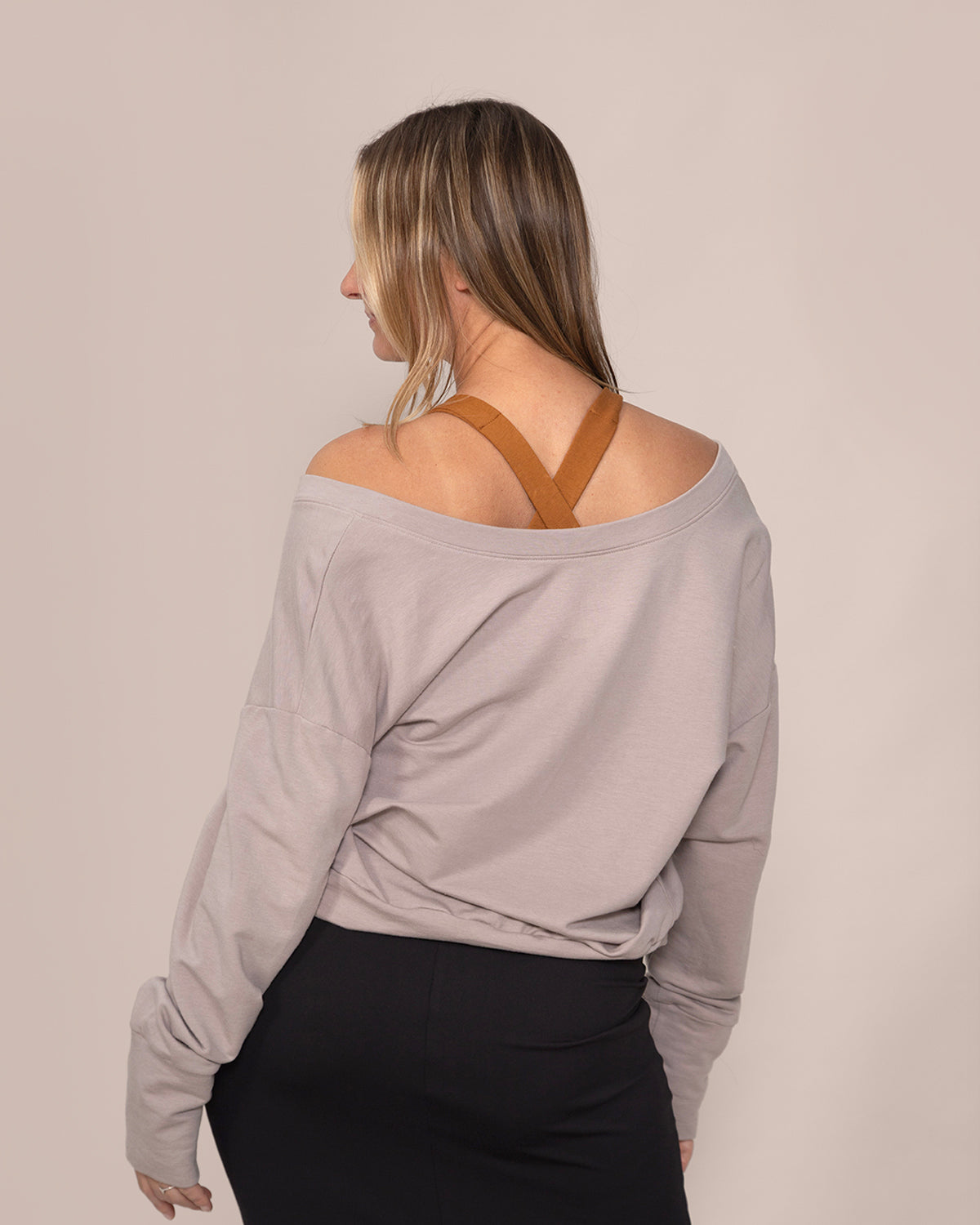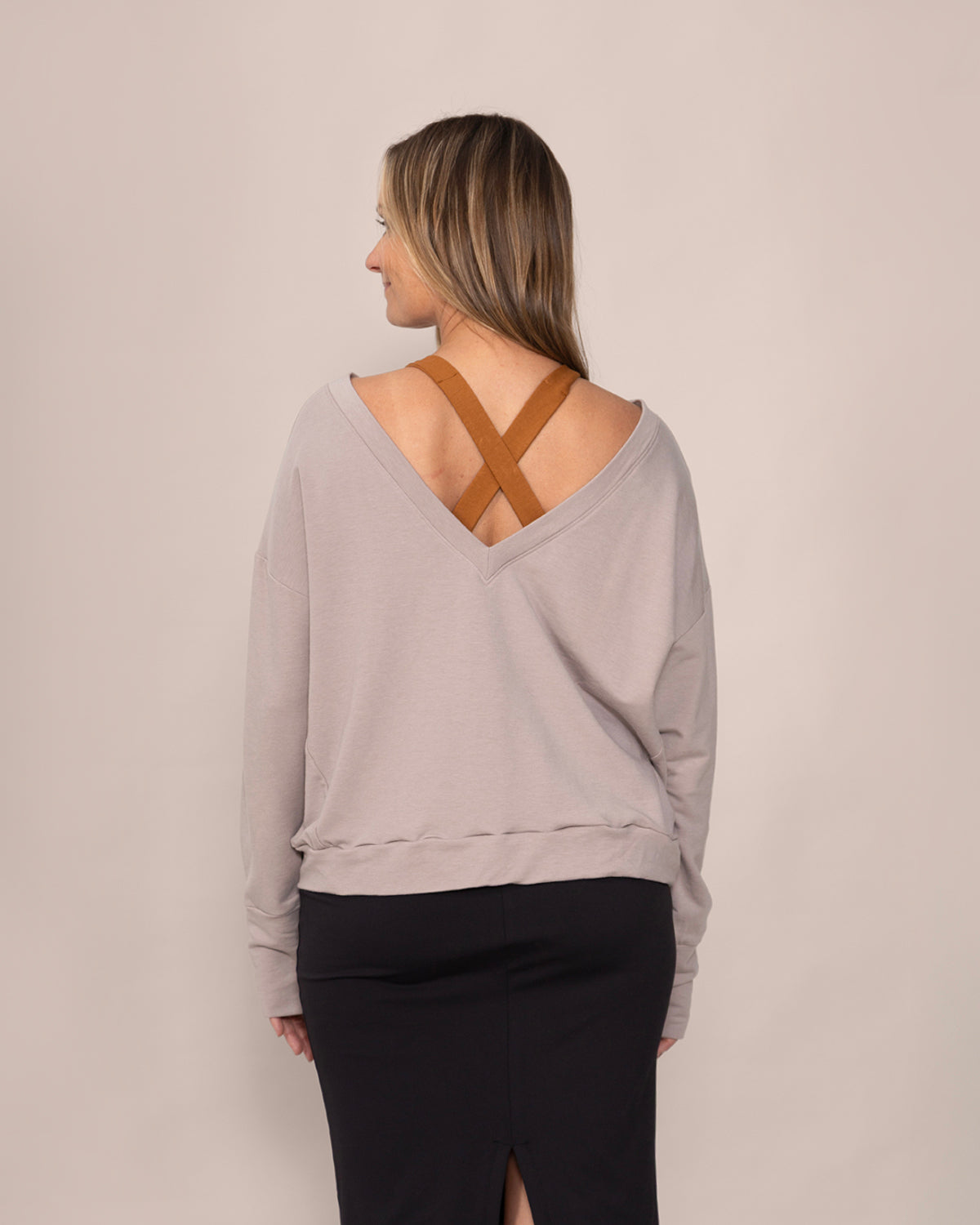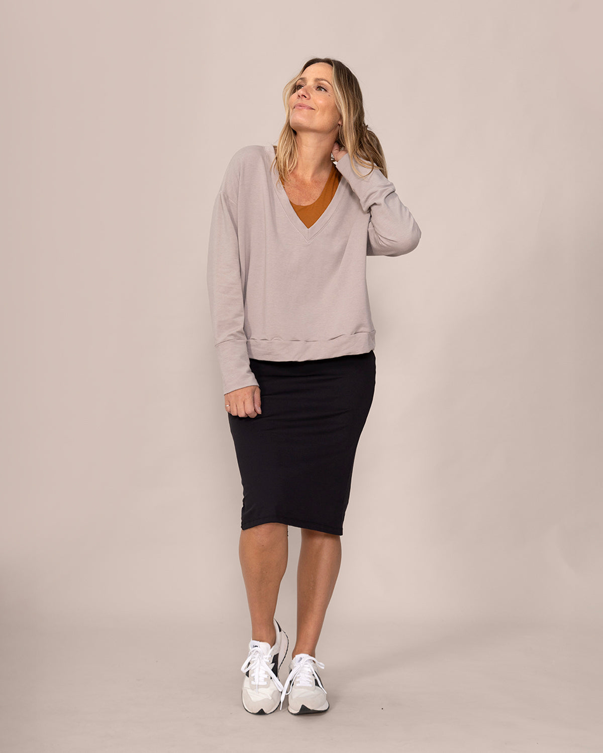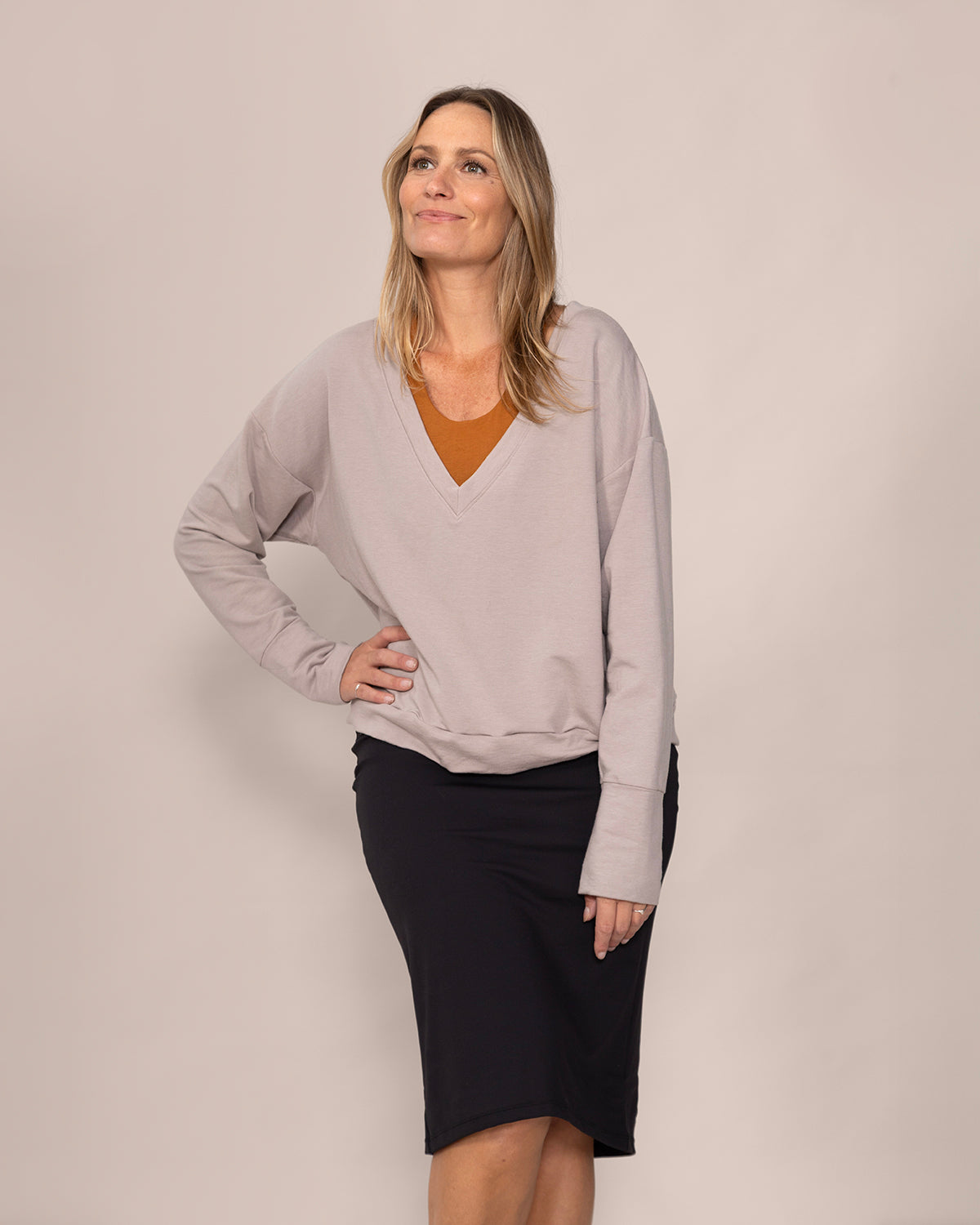 Sur ta liste de choses à faire aujourd'hui : S'AIMER SOI-MÊME. Ce chandail d'un chic sans effort présente une encolure en V profonde que tu peux porter à l'avant ou à l'arrière pour un look féminin et polyvalent. Sa coupe décontractée, ses manches longues et son drapé doux le rendent parfait pour superposer - ou porter légèrement hors de l'épaule pour une touche sensuelle facile. Inspiré de notre robe Tofino best-seller, le chandail Essence à encolure en V capture le même confort et élégance intemporels, maintenant sous forme de chandail confortable. Fabriqué à partir de notre tissu écologique BioLux, un mélange luxueux de tissu éponge français fait de TENCEL™, cette pièce est soyeuse au toucher et bouge magnifiquement avec toi tout au long de la journée. Le confort n'a jamais été aussi beau - promis juré !